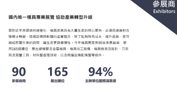 2023年台湾模具展览会TAIMOLD将于2023年08月23日~08月26日在中国港台-台湾-南港区经贸二路1号-台北贸易中心南港会展馆举办,展会的主办方是展昭國際企業股份有限公司,展会的举办周期是一年一届,台湾模具产业目前正面临技术断层及劳动力不足等问题,早期产业靠着低单价及大量生产等策略稳健发展,但现在则需透过智慧制造导入虚实整合等技术,从设计端串联上下制程软硬体,从资讯挖掘、制程管理,形成智慧系统架构,提升产业国际竞争力。