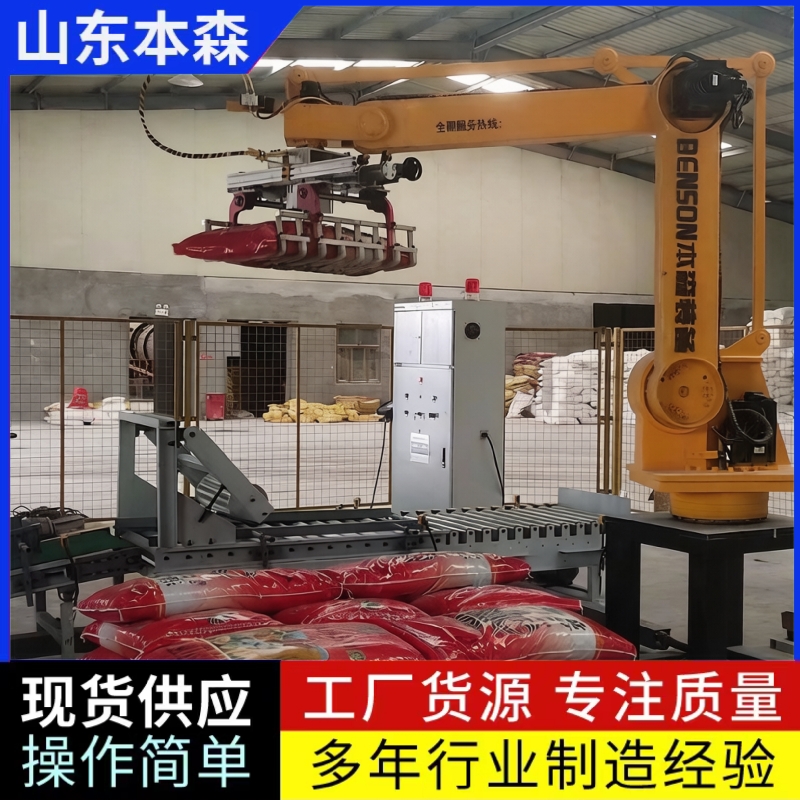 山东本森智能装备拆垛机械手集成3D视觉定位与柔性抓取技术,支持纸箱、袋装、桶装等多类型物料,并提供免费方案设计、上门安装调试及终身维护服务,助力企业降本增效。