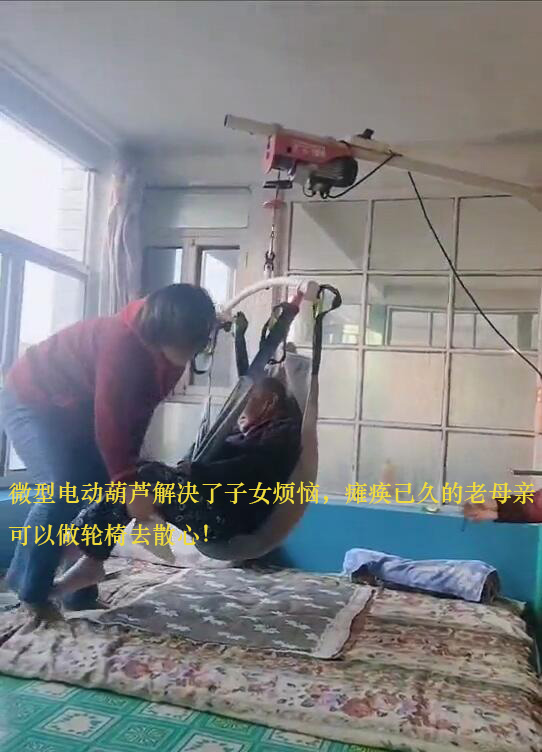 微型电动葫芦属于220v家用微型电动葫芦,更适合在家用使用,因为体积比较小,安装使用更加便携,微型电动葫芦本质是不允许吊人的,但是在这种特殊又很无助的情况下只要保证安全使用,破例使用微型电动葫芦吊人,也是一种美德。对于长期照顾瘫痪真的很累,也是一种煎熬,看到自己的母亲动也动不了,心里也很难受,字母制作了小吊机微型电动葫芦抬妈神器,轻轻松松把老人抬到轮椅,开开心心去散心。