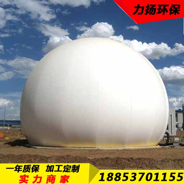 双模气柜原理:底膜、内膜、外膜共同形成两个空间。内膜空间作为储气空间储存各种气体,外膜与内膜夹层的空间作为调压空间。当储存的气体增加时内膜曲张,控制设备排出外膜的调压空气腾出一定的容量。当内膜储存的气体较少时控制设备向调压层注入空气,平衡柜内的压强,稳定外膜刚度。(即用一个软体球形作为储气柜,储存的气体容积变少控制设备就自动充空气填补,储存气体增多安全保护器就释放空气以平衡压力。为不让气体混合,储存的气体与空气之间使用内膜隔离开。)济宁市力扬环保设备制造有限公司边经理——18853701155(VX同步)