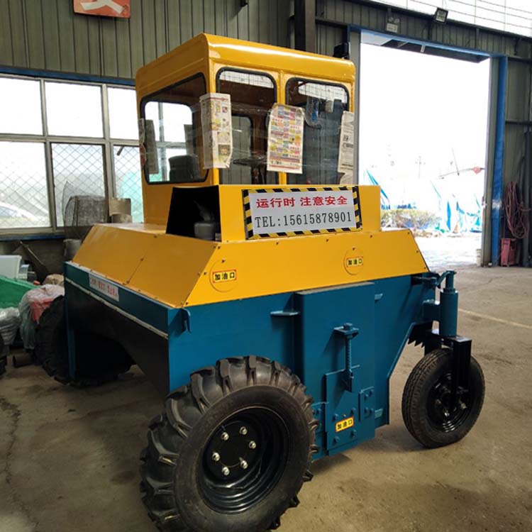 自走式翻抛机拉杆操作原地180°转弯调头,淘汰了方向盘式原地无法调头的烦恼,节省场地、人工、柴油,国内新型产品;方向轮液压平衡,工作中保持整机平稳,不会出现翻堆不彻底的现象;翻堆轴液压升降,可根据物料水分大小进行高、低速翻堆;前方加装物料推板,可使物料条堆均匀,提高翻堆速度和质量;使用传动轴系统,实现了翻堆速度高低可调,淘汰了三角带传动;自走式翻抛机离合采用软驱动,淘汰了铁对铁离合,增加了设备轴、链条、轴承使用寿命。