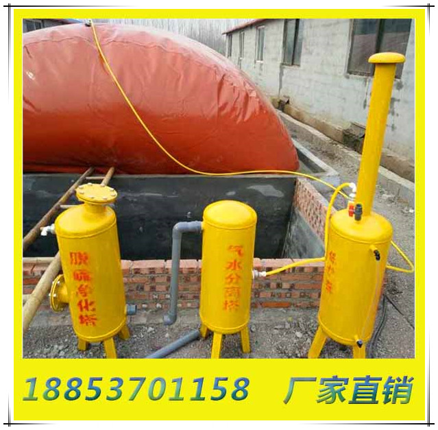 (2)将沼气原料如牛粪猪粪等堆沤,为调节酸碱度可加少量生石灰,一般堆沤3~5天,通过堆沤能迅速形成厌氧菌的富集和生产条件,装入沼气袋后能以短时间达到产气高峰,即可装入软体沼气袋。用夹板封住一端料口,从另一料口加入沼气原料的同时,加100~200公斤污水和沼渣,装完用夹板封好,推动沼气袋使料掺匀,一般2~5天即可产气使用。刚开时产出的气,如因气体混杂不易燃烧,要排放掉,一般情况下排放1~2次,即可着火使用。一次投料可使用六个月左右,产气明显下降时,提前备料堆沤换料。带进、出料口的循环沼气池,沼气材料可随时进出连续产气用气。