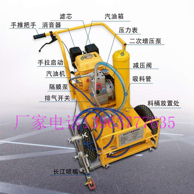 手推式热熔划线机结构先进,易于使用,对交通妨碍很少,各种类型的标线图案都可施工,是热熔标线施工机械中常用的一种。为保证夜间的反光识别性,在标线涂敷的同时划线机自动撒布玻璃微珠,经验证表明玻璃微珠的直径有一半埋入涂膜中反光效果。