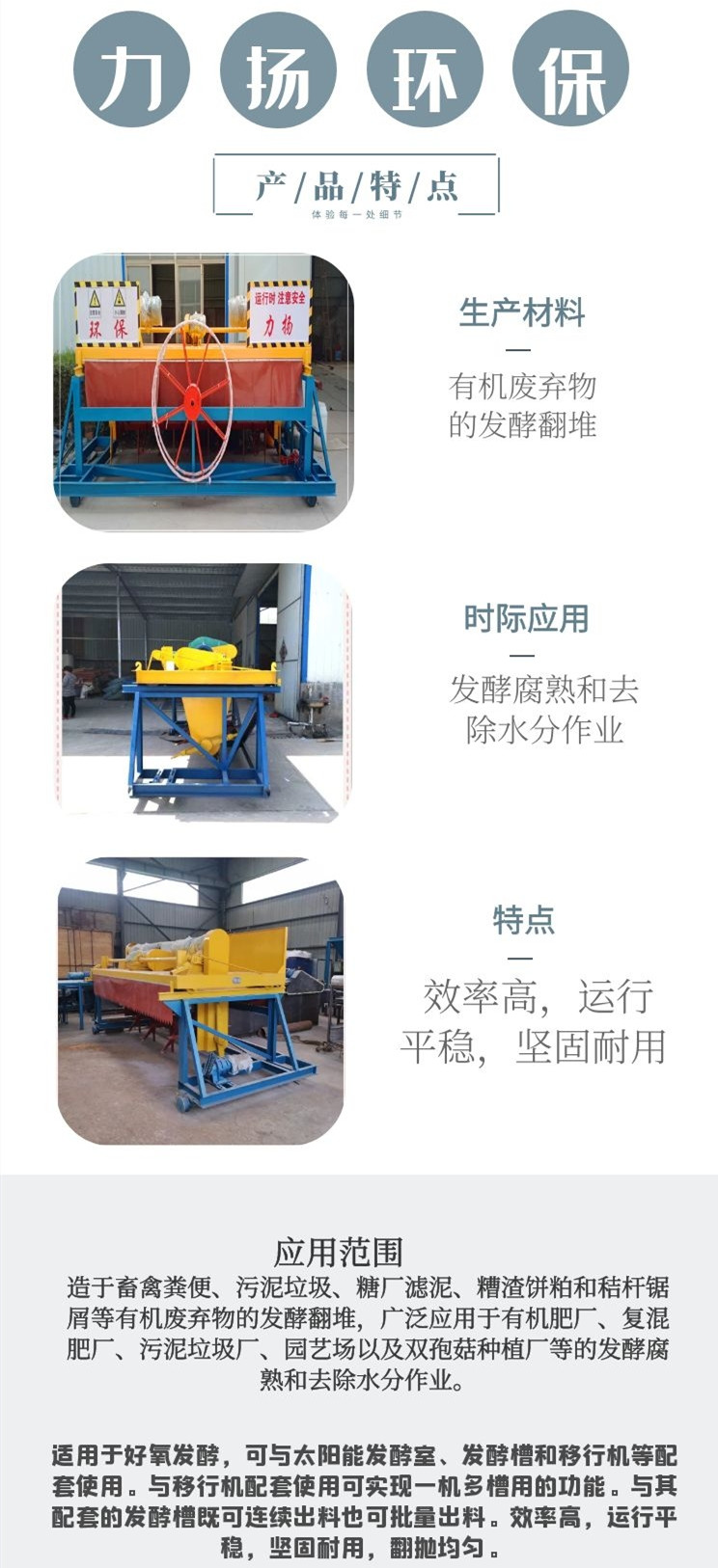 由搅拌、移位两大部分组成。工作时可实现透气、破碎、疏松等功能,是有机肥生产的必备设备。其体积小、工效高、运转稳定,安装灵活、操作简便对场地适应性强,维修简便易于操作。