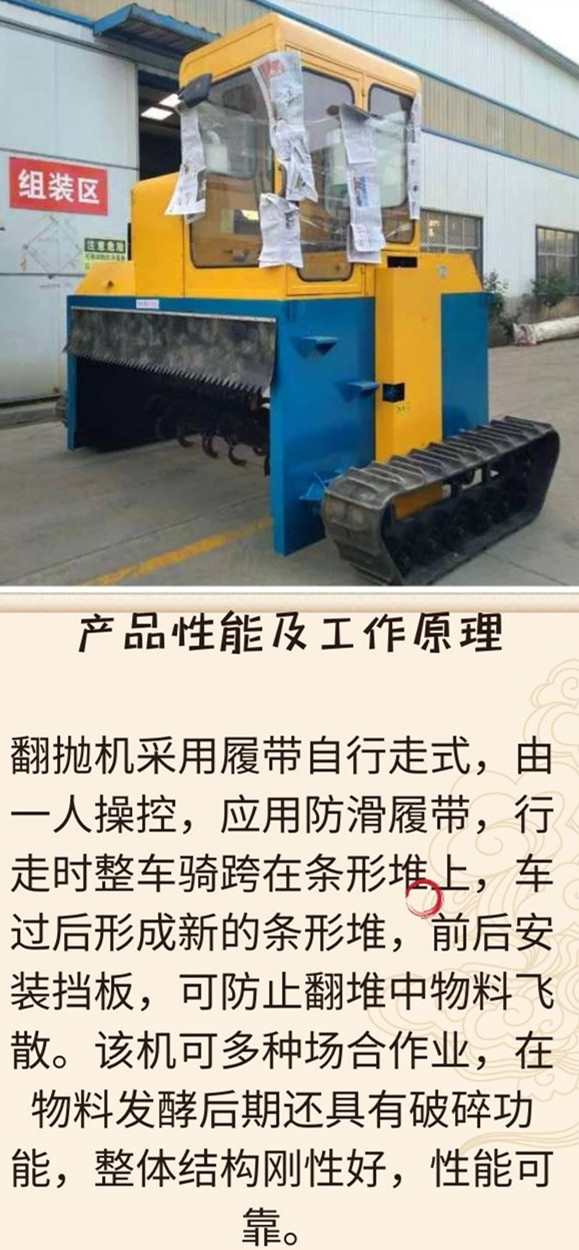 履带式翻抛机该机设备属大型翻堆机的一种,全液压操作系统,拉杆式方向盘操作,履带式行走翻堆宽度可达3米,高度可以达到1.5米高,可原地转弯。履带式翻抛机结实耐用,动力强劲,技术先进,更重要的是产量大、翻抛能力强,被誉为翻堆机里的战斗机。