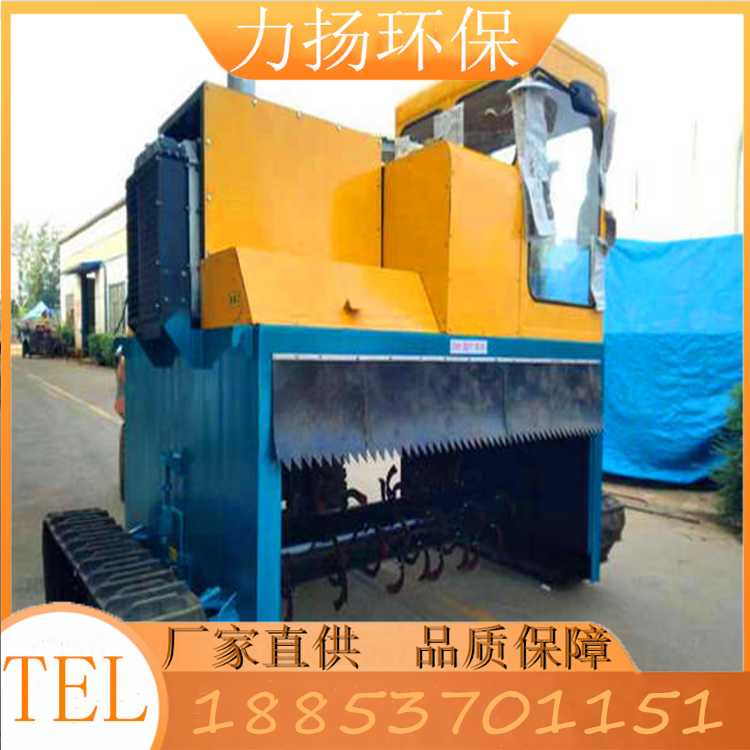 履带式翻抛机行驶中整车骑跨在予先堆置的长条形肥基上,由机架下挂装的旋转刀轴对肥基原料实施翻拌、蓬松、移堆,车过之后篡成新的条形垛堆。