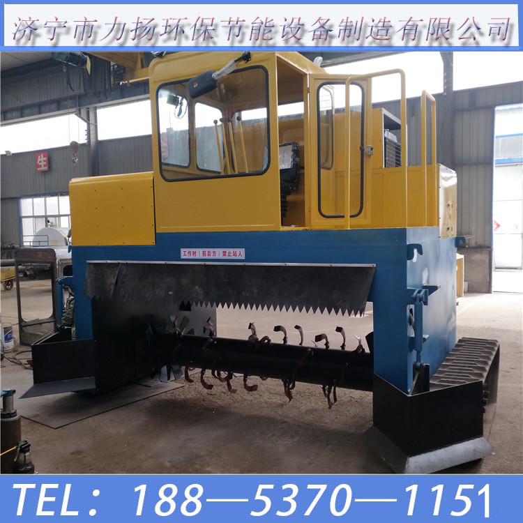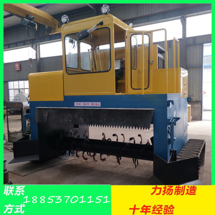 履带式翻抛机安装有滚筒、刀型齿,主要用于平面堆置发酵具有翻拌、破碎双重功效,既能对粪便基料、污泥等物料和菌种进行均匀翻拌,又能对发酵后物料中的板结块进行有效的破碎,是制肥作业中必不可少的专用机具。