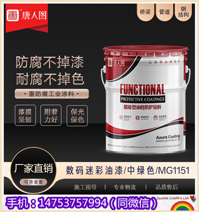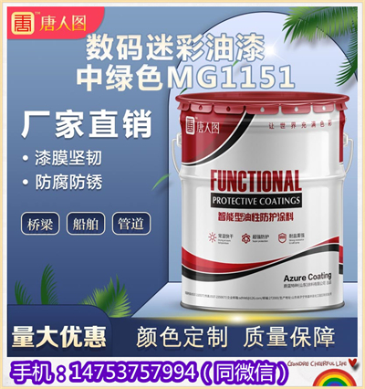 数码迷彩油漆中绿色MG1151是由专用树脂、过氯乙烯树脂、功能性树脂 、增韧剂、专用着色颜料、体质颜料、添加剂、消光剂、分散剂、湿润剂、消泡剂、流平剂、防浮色发花剂助剂及特种功能性助剂同混合溶剂经研磨后调制而成。