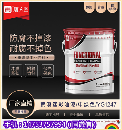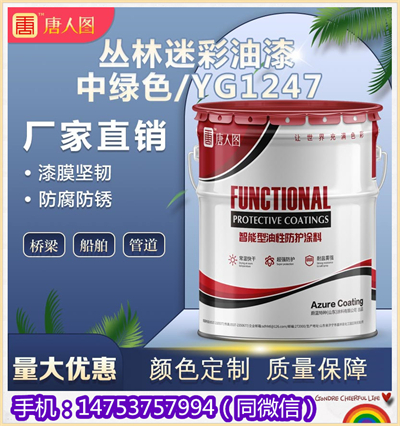 丛林迷彩油漆中绿色YG1247除具有一般涂料的防护性和装饰性外,还具有迷彩变形作用。变形迷彩涂料可根据目标所处的自然背景或活动地域的不同(草原、山地、雪地、荒地、荒漠、丘陵、森林等),采用单色或多色迷彩斑点,以歪曲目标外形特征。因变形迷彩涂料的涂膜与自然背景对近红外光的反射率相同,所以在红外探测下,目标与自然背景融为一体,进而起到伪装的作用。伪装涂料涂膜的颜色有黄绿、中绿、深绿、黄土、沙土、桔草、灰土、褐土、白。伪装涂料按适应波段可分为可见光、近红外侦察伪装涂料。