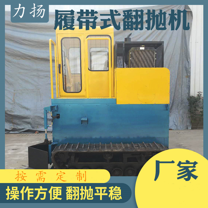 履带式翻抛机是生产生物肥成套设备中的主机,该机采取四轮行走设计,可前进、倒退、转弯,由人操控驾驶。履带式翻抛机行驶中整车骑跨在予先堆置的长条形肥基上,由机架下挂装的旋转刀轴对肥基原料实施翻拌、蓬松、移堆,车过之后篡成新的条形垛堆。履带式翻抛机即可在开阔场地,也可在车间大棚中实施作业。