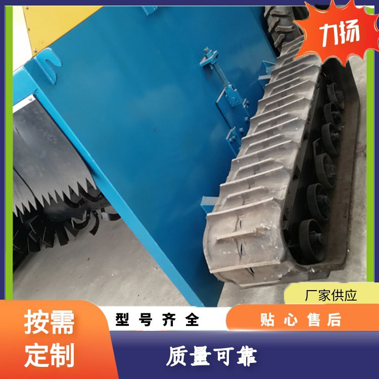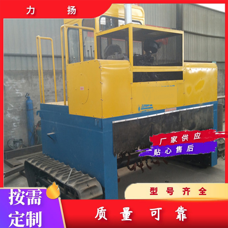 履带式翻抛机工作时骑跨在预先堆放好的长条形原料堆上,由机架下方安装的旋耕刀对物料进行翻抛,螺旋状分布的刀齿高速旋转,把物料打散后抛向后方,重新堆置后的条垛便显得均匀整齐,由于其使用起来方便灵活,因此在小规模的肥料发酵场的好氧堆肥中应用较为广泛。