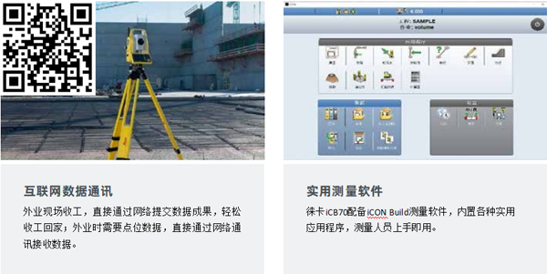 徕卡iCB70全站仪全新配备了互联网移动数据通讯功能,可直接插入SIM卡连接网络。在市政工程测量、基础测绘作业中,外业完成,直接通过网络提交数据,轻轻松松收工回家!
