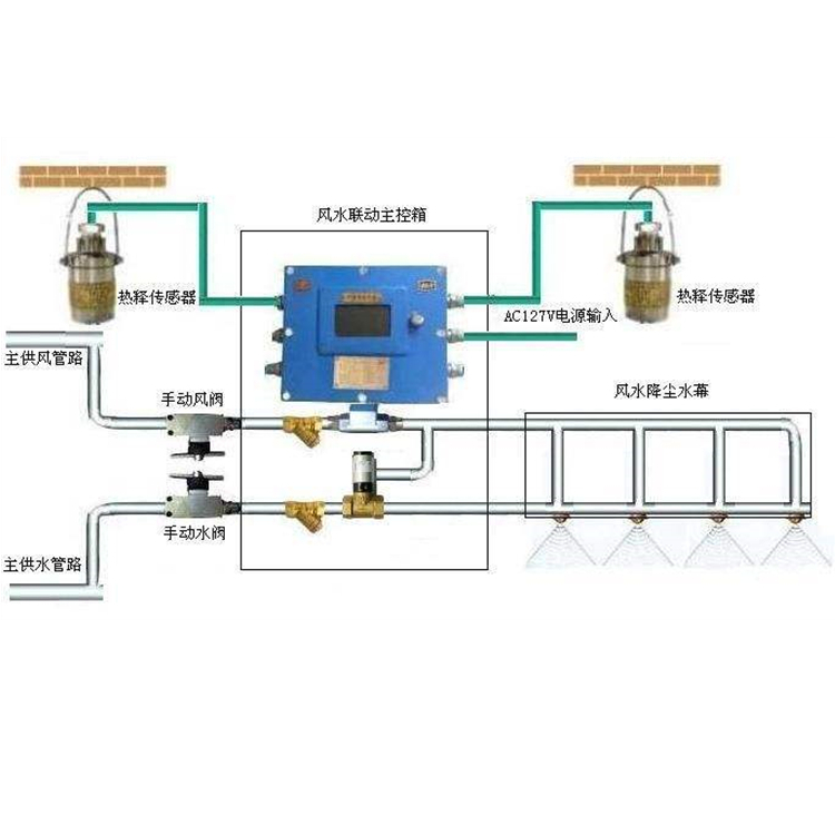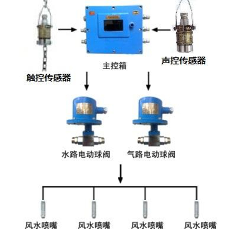 传感器将探测到的控制信号传入主控箱,主控箱同时控制高压水阀、高压水阀开启,将高压风、水输送到风水喷头进行喷雾降尘(风水喷头可对风水压力大小进行调整),喷雾工作至延时时间(延时可调)停止喷雾降尘;当信号再次触发时,进行下一个循环喷雾降尘过程。