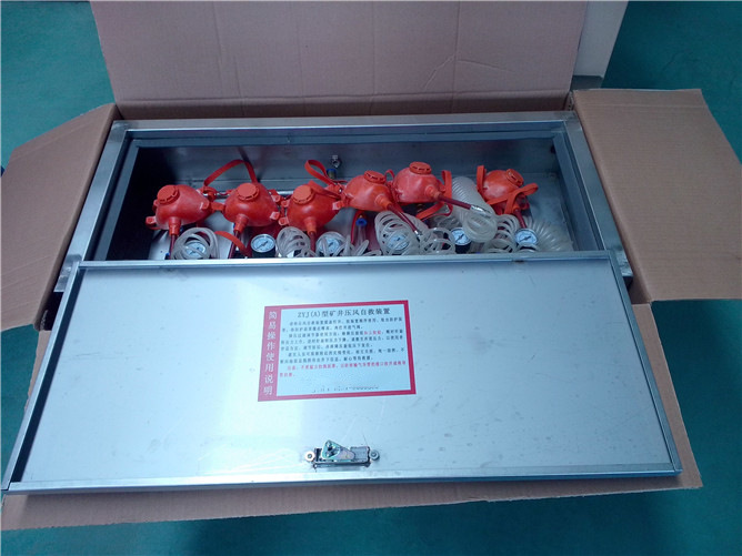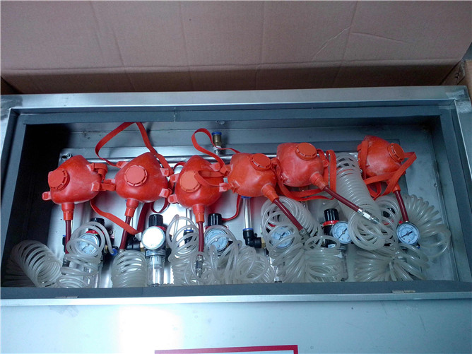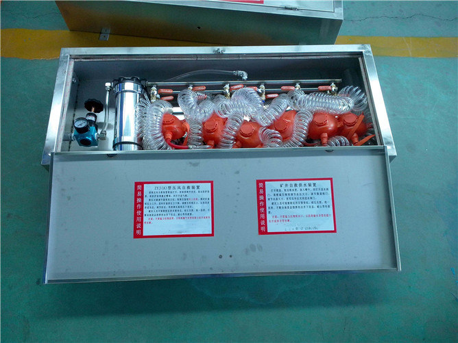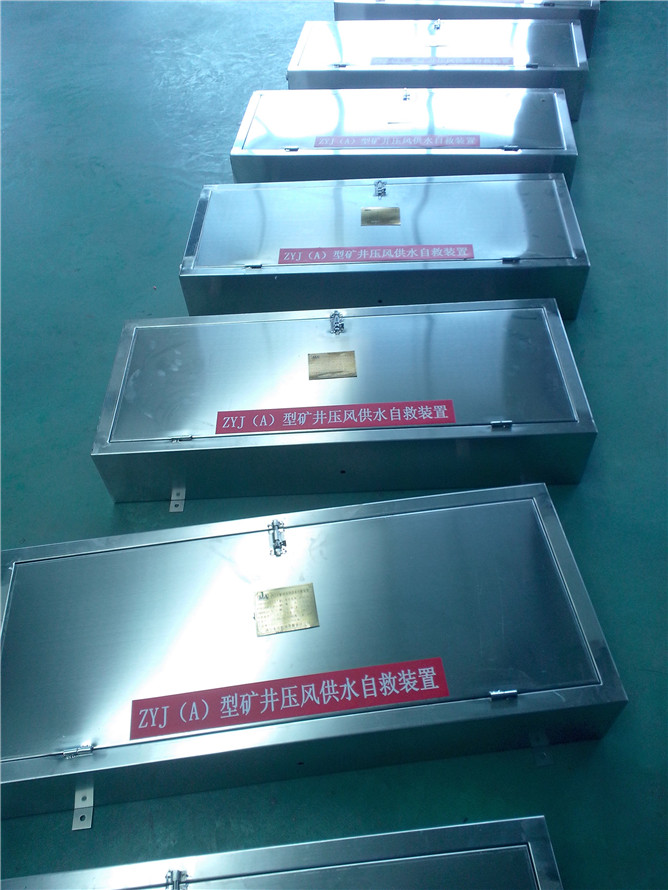 ZYJ-M6型矿井压风供水自救装置,此装置在压风自救装置的基础上增加了,进水管、净水过滤器、水型压力表、排水装置(多组)等。同样箱体、安装板、总进气管、总进水管采用不锈钢制造而成。一箱六组供水,六组供气(可根据要求设计组别)。