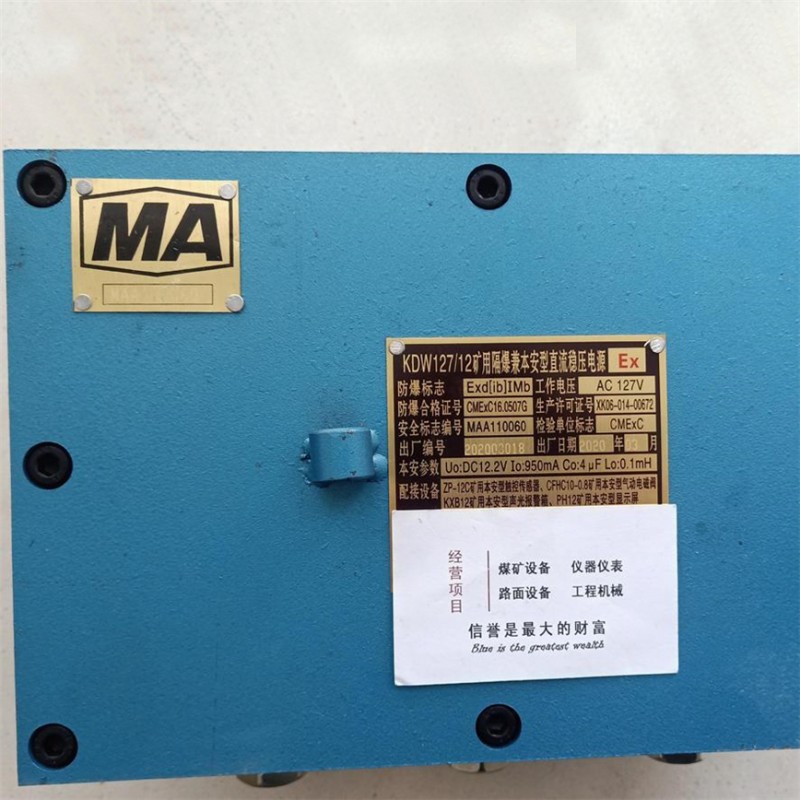 KDW127/12矿用隔爆兼本安型直流稳压电源是根据MT/T408《煤矿用直流稳压电源》煤炭行业标准来设计制造的。可用于煤矿井下或其它周围空气中含有爆炸性(如:甲烷)气体的工矿企业中。