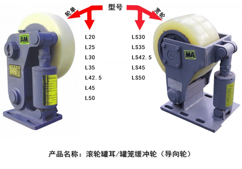 单轮滚轮罐耳L20(滚轮直径200mm)L25(滚轮直径250mm)、L30(滚轮直径300mm)、L35(滚轮直径300mm)、L42.5(滚轮直径425mm)双轮滚轮罐耳LS30(滚轮直径300mm)、LS35(滚轮直径350mm)、LS42.5(滚轮直径425mm)