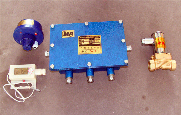 本装置通过烟雾传感器、温度传感器给洒水主控箱信号,来控制电磁阀的通断在特殊部位进行喷洒,达到防尘、防火的目的。在皮带机开启或皮带有物料时进行机头和机尾的防尘,皮带机停止或无物料时,延时一段时间(可调)自动停止喷雾洒水。