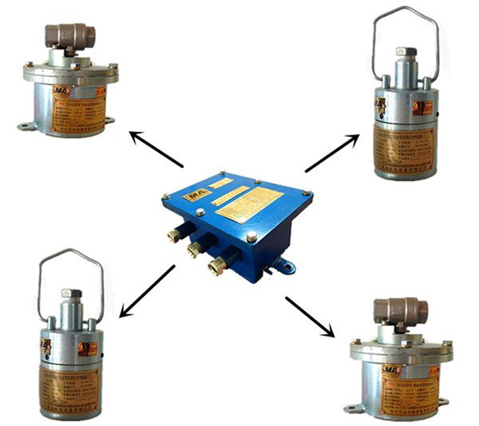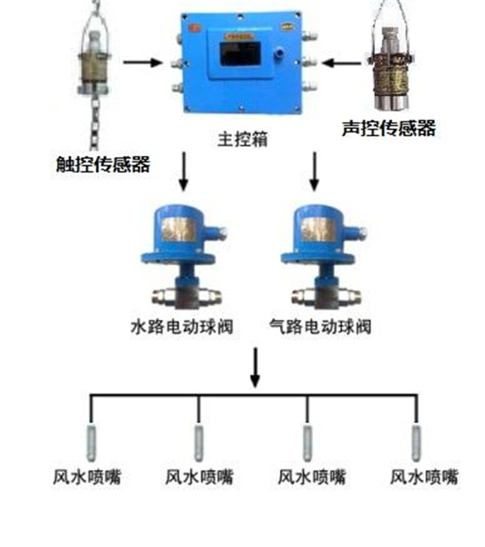 传感器将探测到的控制信号传入主控箱,主控箱同时控制高压水阀、高压水阀开启,将高压风、水输送到风水喷头进行喷雾降尘(风水喷头可对风水压力大小进行调整),喷雾工作至延时时间(延时可调)停止喷雾降尘;当信号再次触发时,进行下一个循环喷雾降尘过程。
