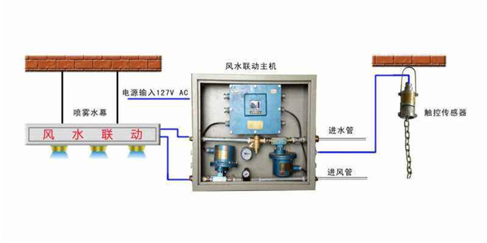 风水联动喷雾又叫气水喷雾、负压诱导式喷雾、风口净化喷雾、全自动风流净化水幕,ZP127矿用自动控制水幕,老型号ZPS127矿用自动风流净化水幕。全自动洒水降尘装置