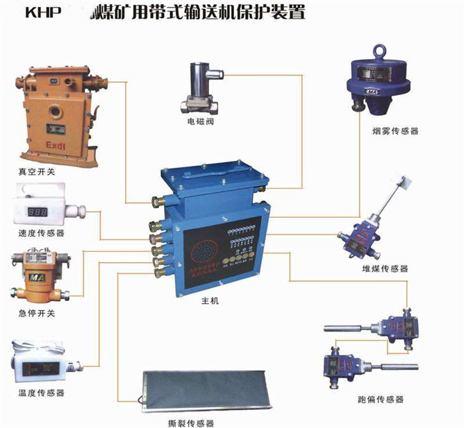 本装置为矿用隔爆兼本质安全型,适用于煤矿中含有爆尘及爆炸性 气体(CH4)的场合,作为皮带运输机的低速、超温、烟雾、满煤、堆煤、跑偏、撕带等事故的综合保护和系统多台皮带机间集中控制及报警通讯之用。配有超温 烟雾自动洒水灭火装置。采用语言加灯光报警方式,新颖独特。