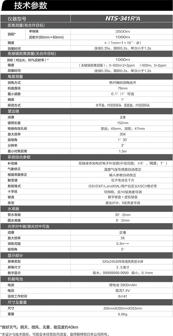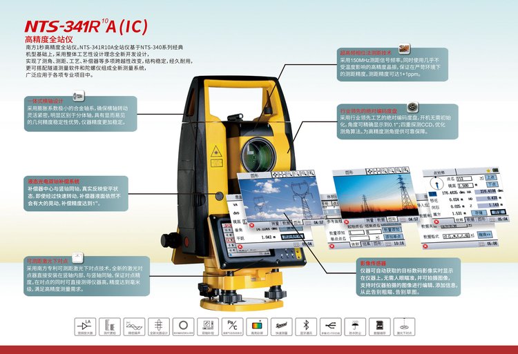 南方1秒高精度全站仪NTS-341R10A 全站仪基于 NTS-340 系列经典机型基础上,采用整体工艺性设计理念全新开发设计,实现了测角、测距、工艺、补偿器等多项跨越性改变 , 结构稳定,经久耐用,更可搭配隧道测量软件和陀螺仪组成全新测量系统,广泛应用于各项专业项目中。