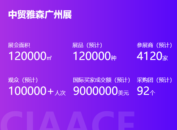 广州汽车用品、零配件及售后服务展览会CIAACE总面积12万平方米,参展企业4120家,参观人数10万+。展会将全面升级,充分整合雅森十余年深度培育后市场积累的80万观众资源,中国交易会拥有的20多万海外买家资源,众多有影响力的行业协会资源和主流媒体资源,以及汽车后市场整个产业链的综合性国际展会。