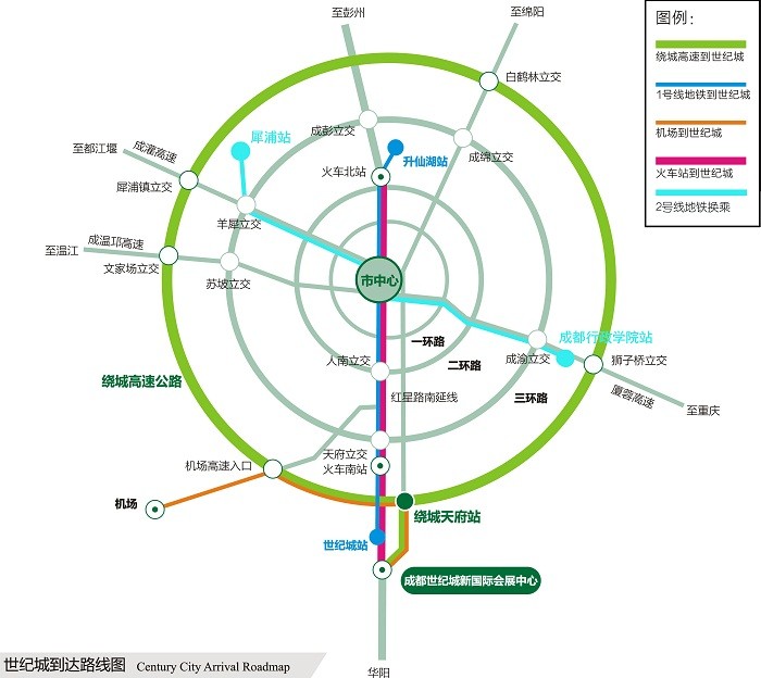 成都世纪城新国际会展中心位于成都市城南新区,占地逾1500亩,西为人民南路南延线天府大道,北邻成都市主要干道外环线,交通条件非常优越。整个项目分为展馆区、国际会议区、酒店及文化设施区、商务办公区、商业住宅区五大部分,总建筑面积约173万平方米。展览馆呈扇形向府南河展开,计17个大小展馆,12万平方米,拥有拥有功能风格各异的大小会议厅、洽谈厅、贵宾厅、迎宾厅、新闻发布中心30多个,面积从50平方米至4000平方米,可容纳30人~3000人,是目前中国会展场馆中功能z完善、z多样、z现代化的国际会议中心。
