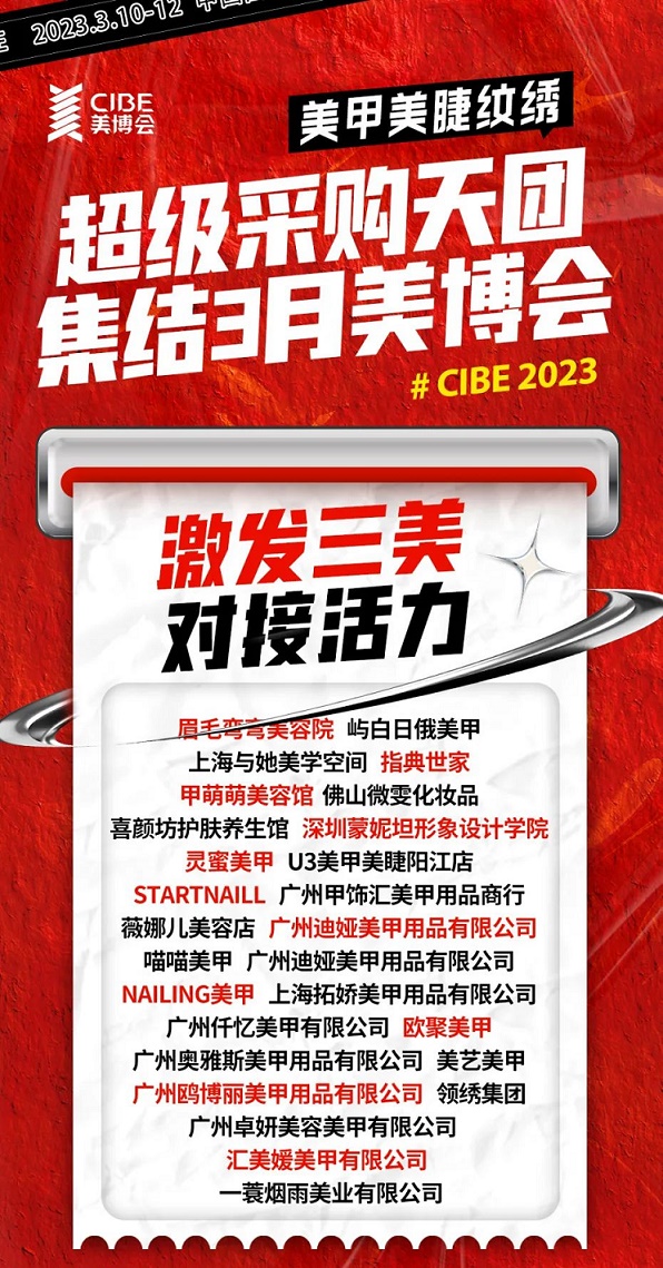 展商阵容**,专业买家组团势不可挡,来自全国20多个省市地区的代理商、经销商、美业连锁机构、美甲美睫门店、医美机构、美业培训学校、MCN机构、社交电商、社群团购等万名买家已火热集结。