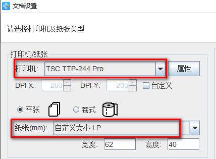 b.下面的纸张我们选择“自定义大小LP”,纸张宽度设置为一行标签纸的总宽度(62mm),包括左右两边空白边距的距离(分别为1mm);纸张高度为单个标签的高度(40mm)。