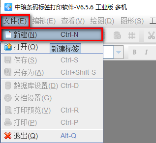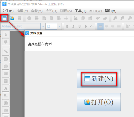 打开中琅标签打印软件,点击软件顶部工具栏中的“新建标签”按钮或者是菜单栏“文件”-“新建”打开文档设置窗口,然后点击“新建”按钮。