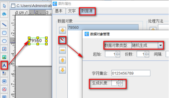 2. a.点击软件左侧的“绘制普通文本”按钮,在白色画布上绘制一个普通文本对象,双击绘制的普通文本,在图形属性窗口中,点击数据源左侧的“编辑”按钮,在打开的数据对象管理窗口中,选择“随机生成”数据类型,字符集合保持不变,生成长度设置为5,随机生成5位数字。