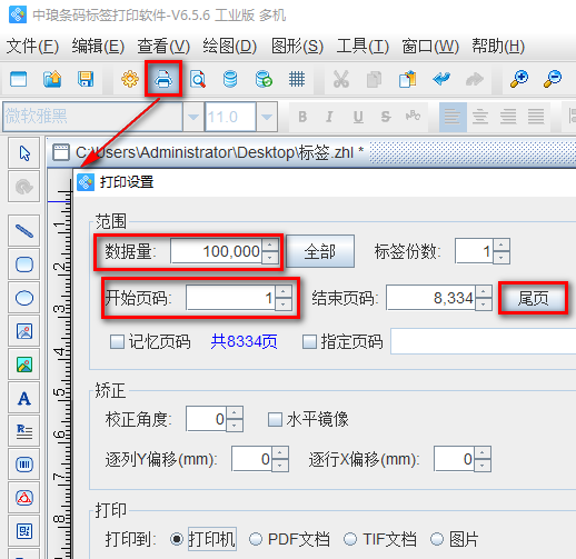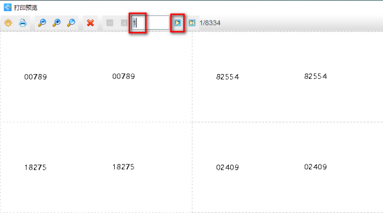 4. 点击软件顶部的“打印”按钮,在打印设置窗口中,设置数据量为100000,开始页码为1,点击结束页码后面的“尾页”,将打印到切换到“打印机”,点击下面的“预览”按钮,翻页查看批量生成的可变随机码,无误之后就可以连接打印机打印或者是输出PDF文档、TIF文档、图片等。