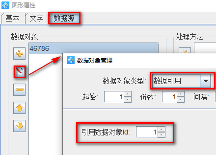3. 点击软件左侧的“绘制普通文本”按钮,再在白色画布上绘制一个普通文本对象,双击绘制的普通文本,在图形属性窗口中,点击数据源左侧的“编辑”按钮,在打开的数据对象管理窗口中,选择“数据引用”数据类型,引用图形对象ID设置为1,那么就将上面普通文本中的内容引用过来了,并且会随着上面普通文本内容的改变而改变。