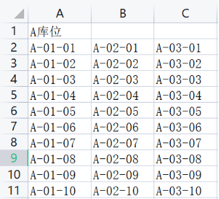 今天遇到了这样一种需求:用户想要使用中琅条码编辑软件批量打印一些仓库库位条码,用来区分库位,一个库位一个条码,例如条码数据A-02-03,表示A列货架-第二排-第三个货品。用户的条码数据在excel表中保存着,如下图: