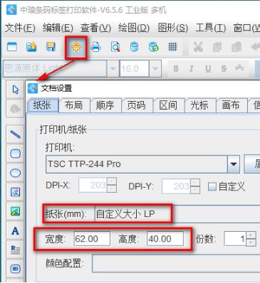 2. 打开中琅条码编辑软件,根据打印机中的实际纸张设置纸张尺寸和布局,这里我们以总宽度为62mm,高度为40mm的单排标签纸为例,左右页面边距的距离都为1mm。