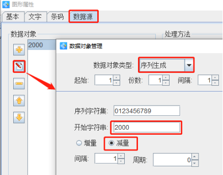 切换到“数据源”选项卡,点击下面的“编辑”按钮,在打开的数据对象管理窗口中选择“序列生成”数据类型,下面的“开始字符串”设置为2000,选中下面的“减量”单选按钮,其他的保持不变,点击“编辑”按钮,即可在数据源中生成2000,1999,1998,1997……这样的倒序流水号,那么由这些倒序流水号生成的条码就是倒序流水号条码了。