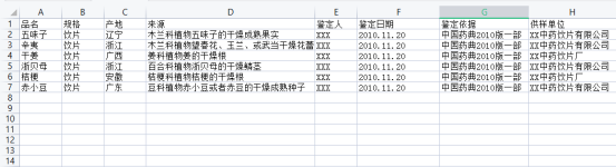 1.首先我们需要先把中药饮片标本标签的可变信息保存到excel表中,并且一项为一列,比如品名排成一列,产地为一列……