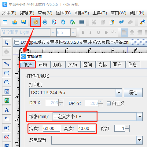 2.打开中琅标签批量制作软件,根据打印机中的实际纸张设置纸张尺寸和布局,这里我们纸张设置为总宽度为63mm,高度为40mm的单排标签纸。