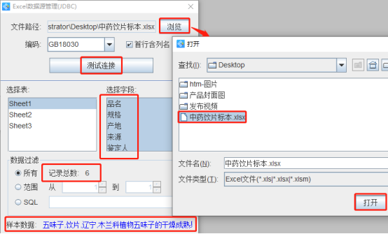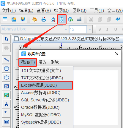 3.将保存有中药饮片标本内容的Excel表导入到软件中,具体方法可以参考《中琅条码打印软件数据库连接详解》