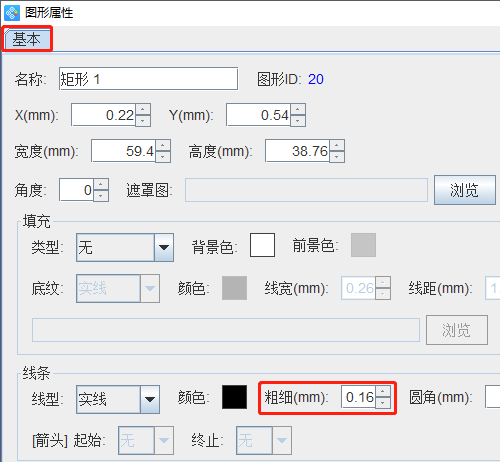 4.绘制矩形框 点击软件左侧的“绘制圆角矩形”按钮,在白色画布上绘制矩形框。另外矩形框线条的粗细可以在图形属性-基本选项卡中进行设置。