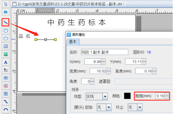 6.绘制直线 点击软件左侧的“绘制线段”按钮,在白色画布上绘制直线,绘制直线的时候要同时按住键盘上的“shift键”。另外直线线条的粗细可以在图形属性-基本选项卡中进行设置。