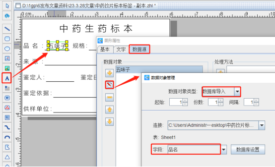 7.添加中药饮片标本标签上可变内容 a.点击软件左侧的“绘制普通文本”,在画布上绘制一个普通文本对象,双击绘制的普通文本,在图形属性-数据源中添加一个“数据库导入”类型的数据,字段选择“品名”。