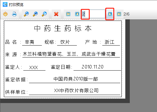 8.点击软件顶部的“预览”按钮,翻页查看批量生成的中药饮片标本标签,无误就可以连接打印机打印了。
