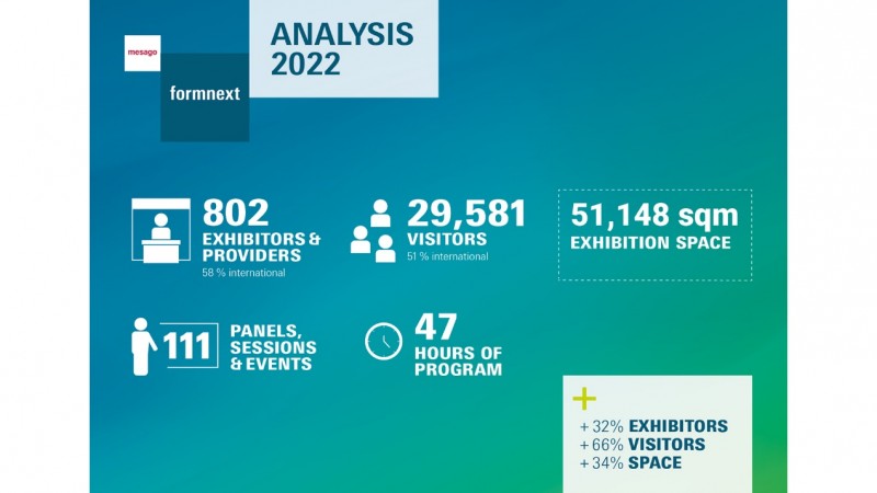 Formnext 2022成绩喜人,展览面积51, 148平方米,较2021年增长了34%。2022年为期四天的展会有802家展商和29581名观众参加,相比2021年分别增加32%和66%,并保持50%以上的国际化。