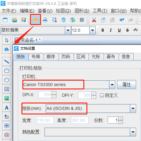 打开中琅可变数据排版软件,根据实际纸张设置纸张尺寸和布局,这里纸张我们设置为A4纸,标签行列数设置为7行4列,纸张上下左右页面边距(上下左右非打印区域距离)都设置为5mm,标签的水平间距和垂直间距都设置为3mm。