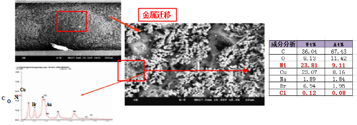 导线之间的金属迁移是导致失效品微漏电的主要原因。当PCB板在阻焊膜印制前的处理工序中由于清洗不净而造成局部区域处理液残留时,会造成该处基材与阻焊膜之间结合不良而生成板面外观上的白斑。产品组装并使用时,相邻导线在偏压影响下,白斑区域的板面上会逐渐发生金属离子性物质的迁移,并在板面上出现树枝状盐类沉积物并不断蔓延伸展,导致相邻导线之间的绝缘电阻值降低甚至短路。