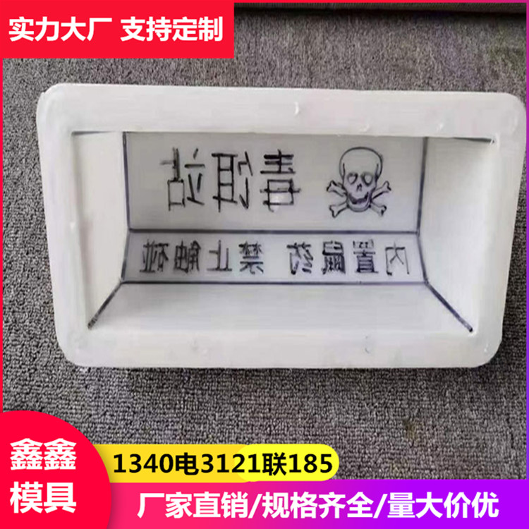 保定鑫鑫建材模具厂定制毒饵站模具。鼠毒饵站模具是以生产混凝土毒饵站为基础,尺寸比较小,制作起来非常便利,一般都是以塑料模具为主,生产混凝土毒饵站制品,经常用在东北三省地区,毒饵站是被用到保护粮仓、治理鼠患的需要中,对于模具的防护方法有很多种,下面就来详细的介绍一下在使用模具之前一般都会在模具表面涂上一层脱模剂,这样不仅是能够方便模具进行脱模,而且能够达到一定的保护模具的作用。其次,在使用毒饵站模具 灭鼠毒饵站模具进行毒饵站的生产过程中要注意保护好模具,一般都需要做到轻拿轻放。一般都要遵循步骤来进行毒饵站的生产,要预防坚硬的工具与模具表面直接接触,这会对模具造成不必要的损害,影响模具的反复使用。