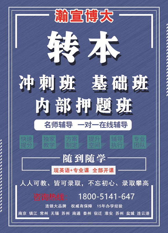 江苏瀚宣博大专转本是五年制专转本备考生的福音,根据学员的不同基础为其提供五年制专转本专业咨询、详细院校介绍、各个模块英语辅导、专业课教学、统一报名、集体送考、志愿填报等一系列流程化服务,每年还有模拟考,通过这次考试一方面也可以了解自己的大致排名,为填报志愿作参考,一方面行针对性的辅导和查漏补缺,发挥优势,弥补短板,让考生对五年制专转本的了解更加深入,备考更轻松,更有方向性!同学和家长有空余时间可以先来实地考察上课环境、师资情况及录取率后再做考虑。全年滚动开班,随到随学,江苏13市高职院校1-5年级备考生均可报名参加,一次报名可循环上课至考前,越早报名,课时量越多,基础越扎实。更多五年制专转本详情请联系1800微5141同647严老师,预约试听课程并领取招生简章一份。