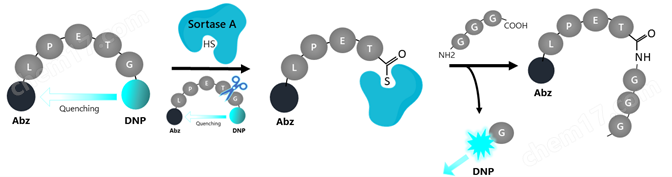The fluorescence emitted by donor DNP is quenched due to the proximity of the Abz acceptor in the intact peptide. The protease cleaves the peptide between T (threonine) and G (glycine) and forms an intermediate complex between the cysteine residue within the active site and the C-terminus of the peptide substrate. The cleaved substrate is then covalently bounded to the triglycine nucleophile. The glycine-DNP fragment is released, freeing the emission of fluorescence by DNP.