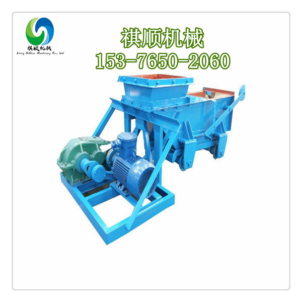 K型给料机由机架、底板(给料槽)、传动平台、漏斗、闸门、托辊组成,当电机开动后经弹性联轴器,减速机、曲柄连杆机构拖动倾斜5度的底板,在辊上作直线往复运动,把煤或其它磨琢性小,粘性不大的松散粒状,粉状物料从给料设备中均匀地卸到受料设备中